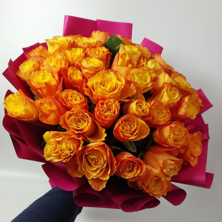 На фото букет из 35 оранжевых роз. В составе: роза 35 шт, дизайнерская упаковка 1 шт, атласная лента 1 шт, . Все цветы свежие и ароматные, букет красиво оформлен и отлично подходит для подарка. Доступна доставка цветов или самовывоз.