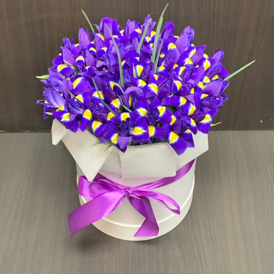 51 фиолетовый ирис в шляпной коробке в Курганинске