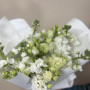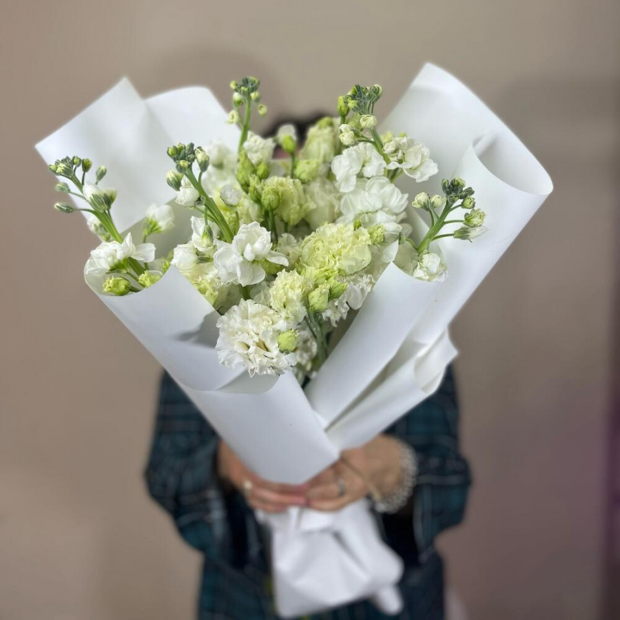 На фото букет из белых матиол и эустом. В составе: эустома (лизиантус) 7 шт, маттиола 5 шт, дизайнерская упаковка 1 шт, атласная лента 1 шт, . Все цветы свежие и ароматные, букет красиво оформлен и отлично подходит для подарка. Доступна доставка цветов или самовывоз.