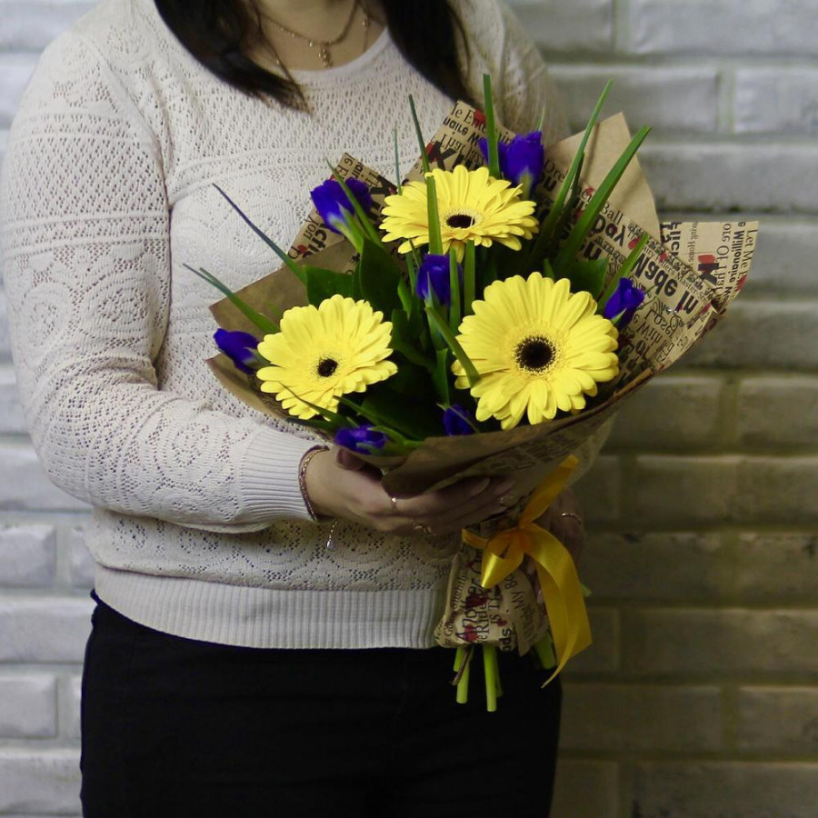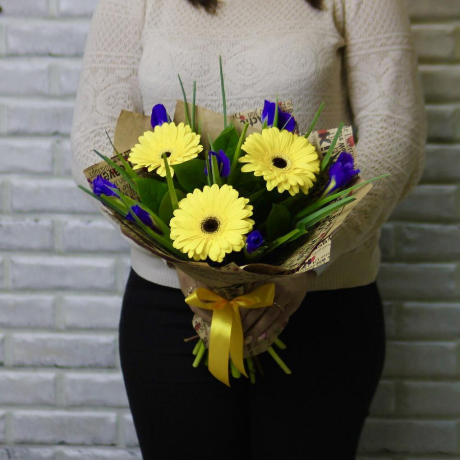 На фото букет из желтых гербер с синими ирисами. В составе: ирис 8 шт, гербера 3 шт, салал 1 шт, крафт-бумага 1 шт, атласная лента 1 шт, . Все цветы свежие и ароматные, букет красиво оформлен и отлично подходит для подарка. Доступна доставка цветов или самовывоз.