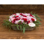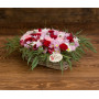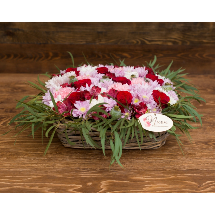Любая представительница прекрасного пола сходит с ума от роскоши, поэтому она будет счастлива принять в подарок огромную корзину цветов. Здесь грамотно сочетаются великолепные розы, шикарные гвоздики, нежные танацетумы, восхитительные гиперикумы и прелестный оазис.