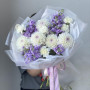 Букет из розовых ранункулюсов и сиреневой матиолы
